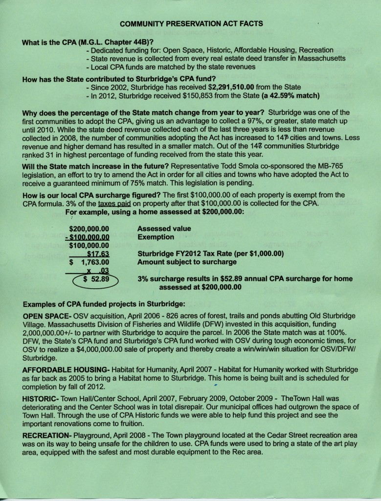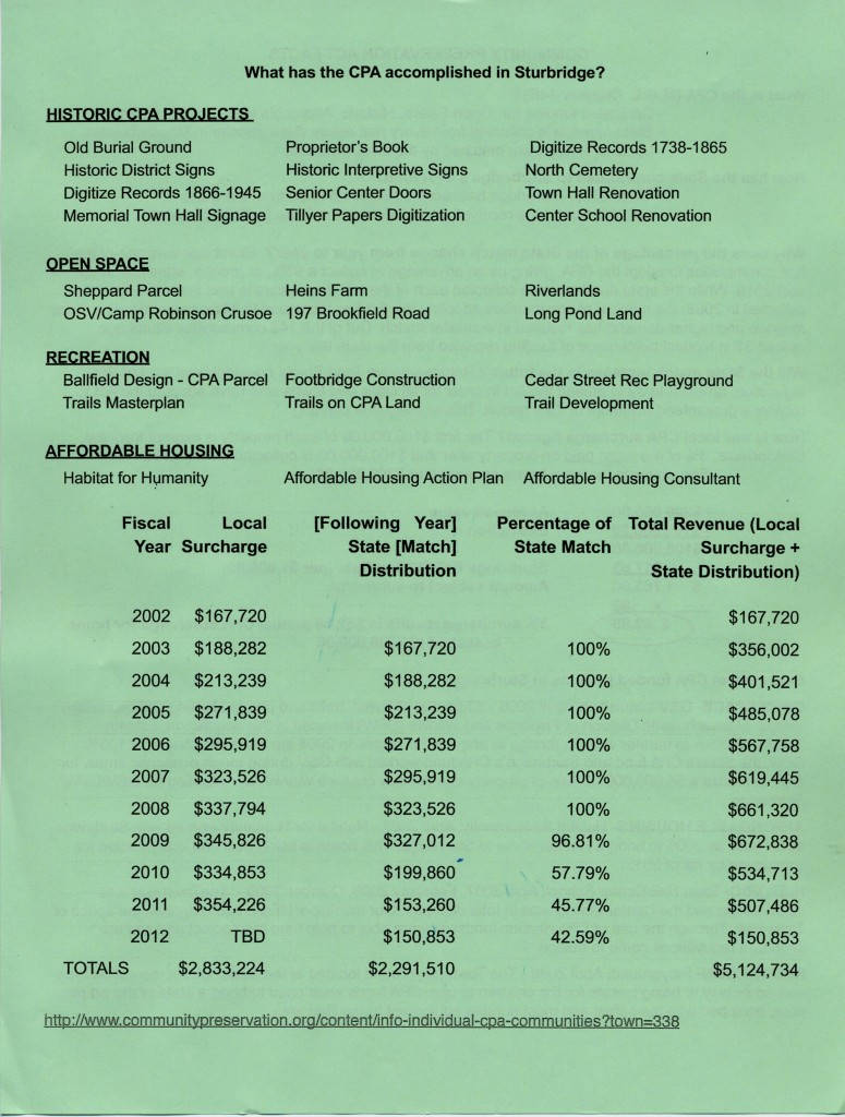 There is an effort going on in Sturbridge to rescind the town’s participation in the Massachusetts program called the Community Preservation Act. I have received a fact sheet about the benefits that Sturbridge derives from its participation.