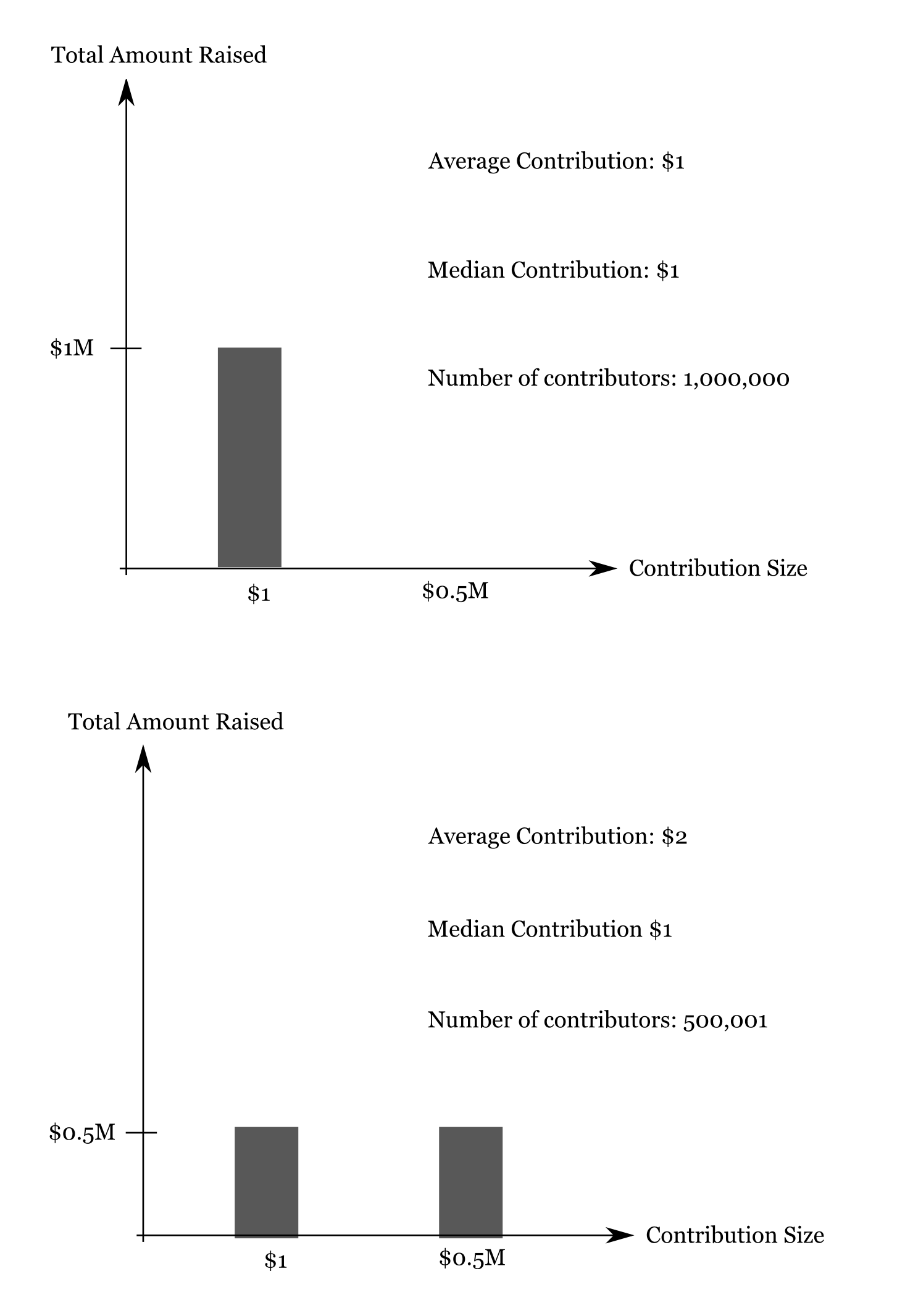 The top example has an average contribution of $1, whereas the bottom example has an average of $2. In both cases, the median is the same. In other words half the people contribute a dollar or less, and half the people contributed a dollar or more. However, in terms of influence of large donors, the situation could hardly be more different.