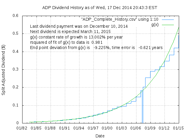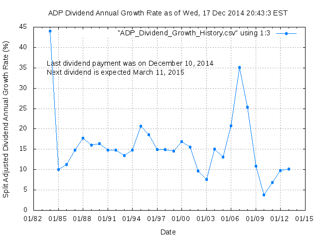 Dividend Growth Rate, min = 3.76% per year, mean = 15.74% per year, std. dev. = 3.20%, "Sharpe Ratio" = 4.91