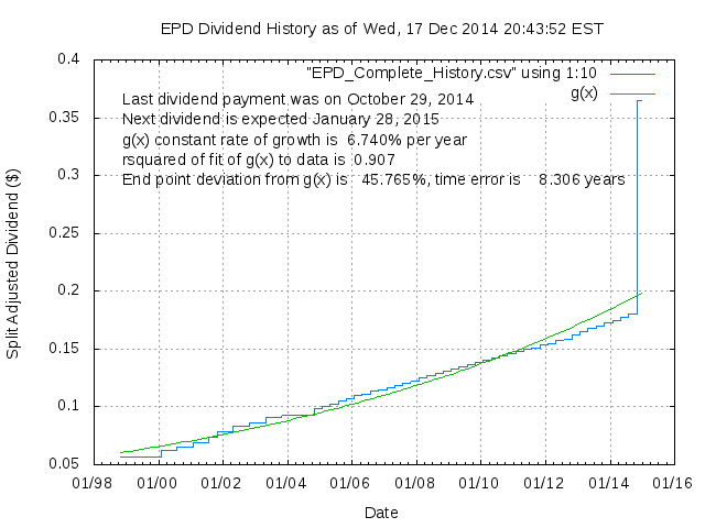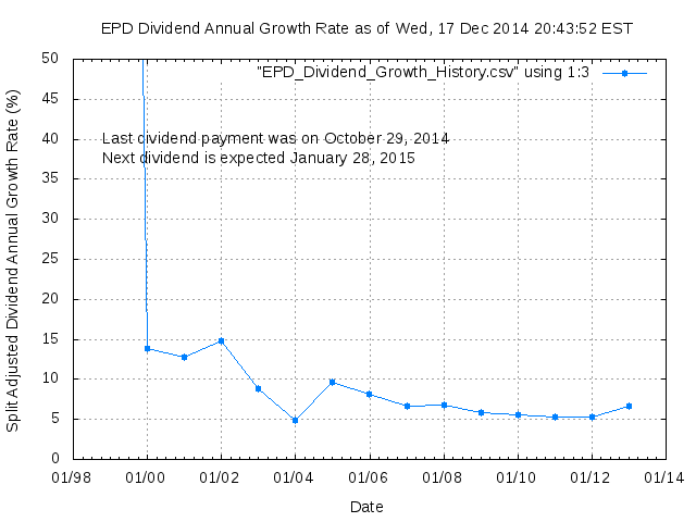 Dividend Growth Rate, min = 4.85% per year, mean = 27.66% per year, std. dev. = 20.12%, "Sharpe Ratio" = 1.37
