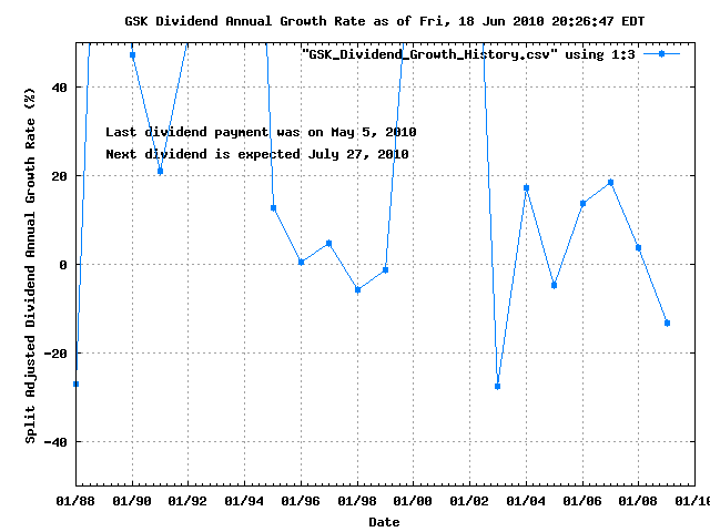 Dividend Growth Rate, min = -57.91% per year, mean = 23.45% per year, std. dev. = 13.47%, "Sharpe Ratio" = 1.74