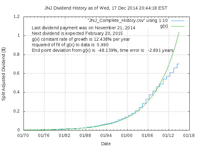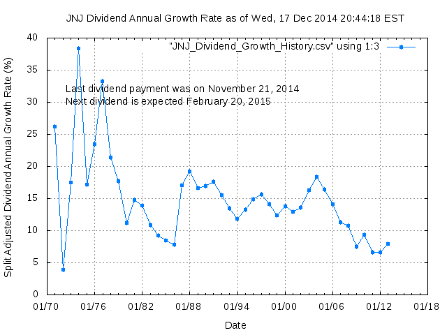 Dividend Growth Rate, min = 3.91% per year, mean = 14.88% per year, std. dev. = 2.48%, "Sharpe Ratio" = 6.01