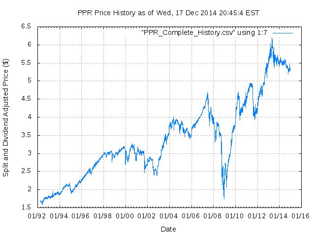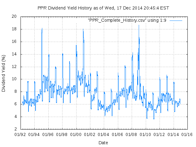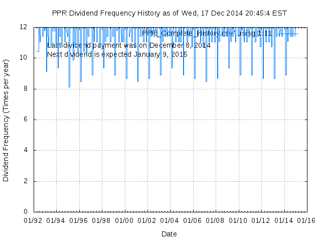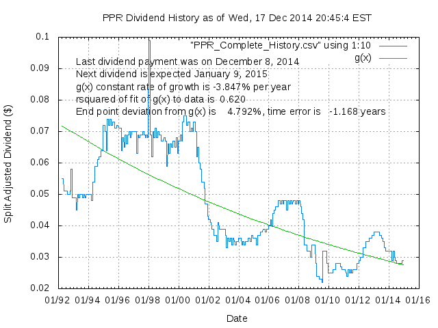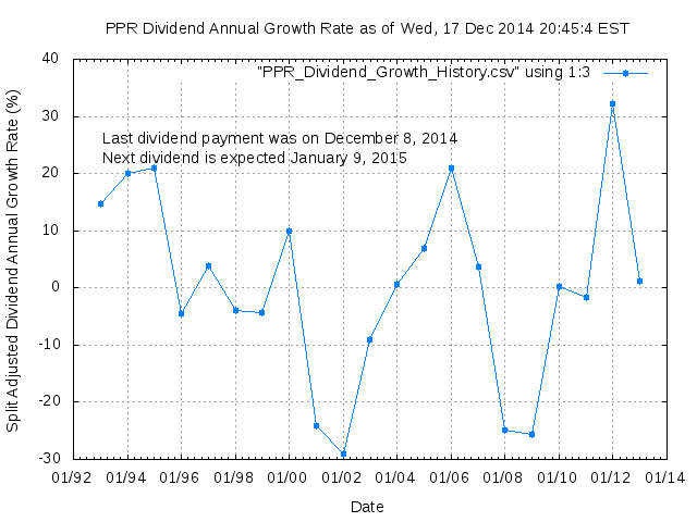Dividend Growth Rate, min = -29.05% per year, mean = 0.40% per year, std. dev. = 3.54%, "Sharpe Ratio" = 0.11
