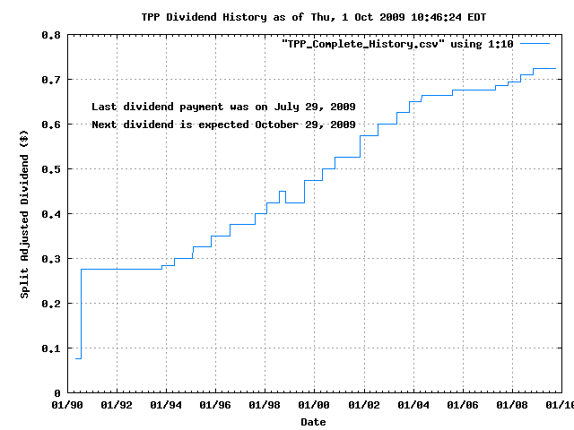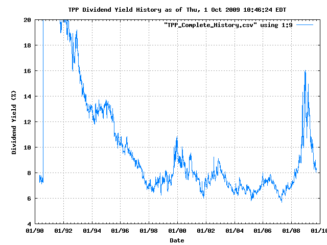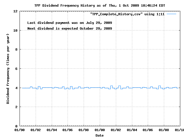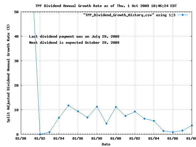 Dividend Growth Rate, min = 0.00% per year, mean = 9.68% per year, std. dev. = 4.49%, "Sharpe Ratio" = 2.16