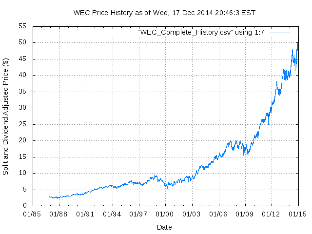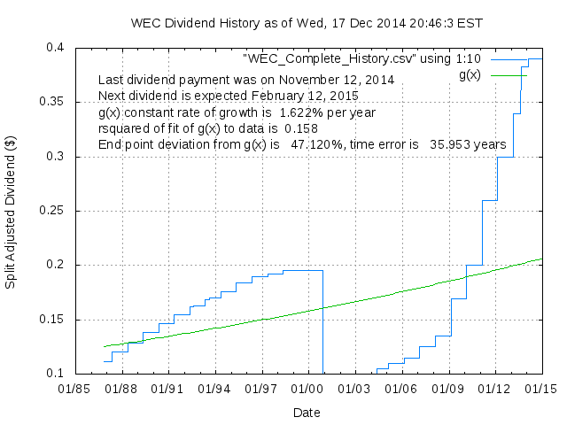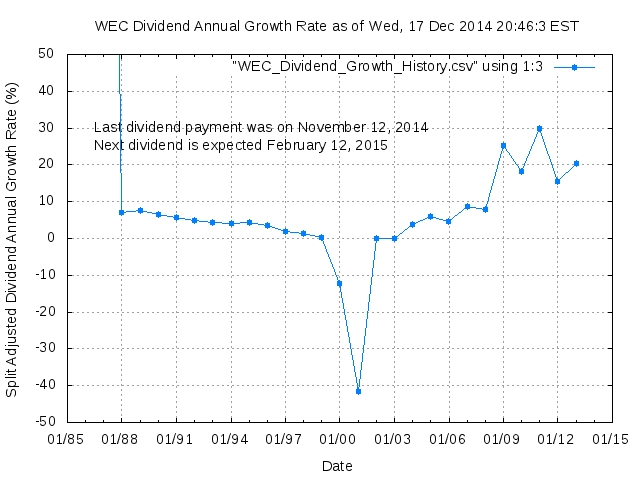 Dividend Growth Rate, min = -41.61% per year, mean = 16.99% per year, std. dev. = 13.16%, "Sharpe Ratio" = 1.29